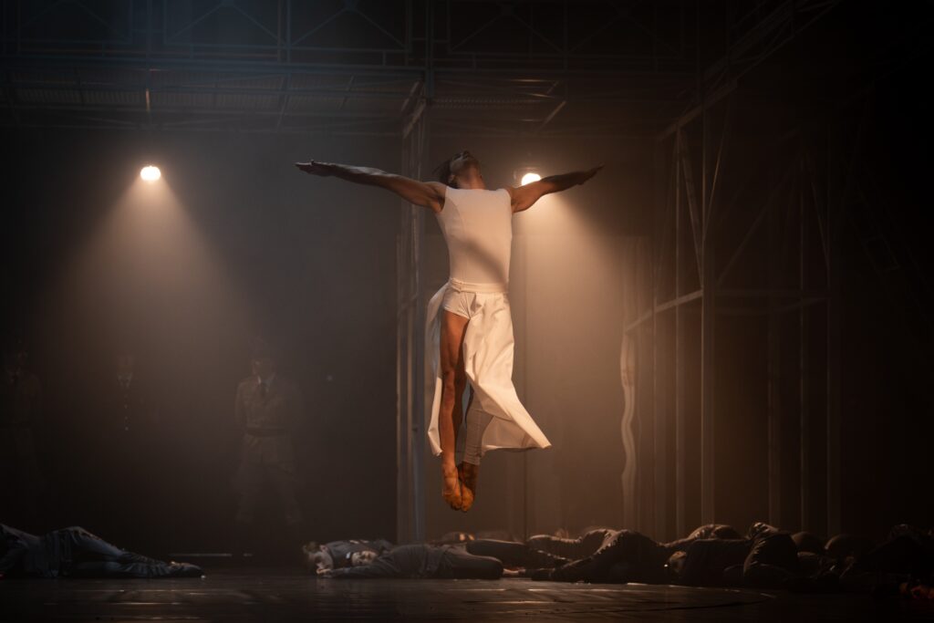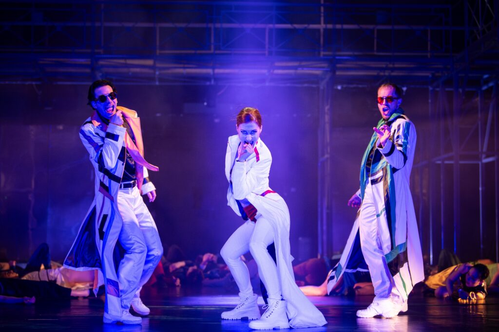 Zvrat prichádza v momente, keď sa na scénu postupne zapojila trojica tanečníkov stelesňujúca Vieru, Nádej a Lásku. Už v hľadisku prinášali iný pohyb, kontrastnú emóciu, ako tú, čo sa odohrávala na scéne. Pomalé, dôsledné pohyby viedli Stariňák, Sorbino, Bánayai, ktorí sa stali zrazu stredobodom pozornosti. Ukazovali svoju vnútornú silu a zrazu pútali pozornosť davu. Je úžasné, ako si len v istom okamihu uvedomíte, že v zboroch už nie je tá uniformita, ktorú ste doposiaľ vnímali. Ondrej Šoth ako choreograf dokáže presne vystihnúť ten okamih prekvapenia a zmenu priniesť mimovoľne, o to je však vyčnievajúca, jej odkaz naliehavejší. Najprv je trojica „iných“, netancujúcich v rytme s davom na smiech – davy na nich ukazujú prstom a smejú sa. Bol to jeden z najsilnejších okamihov predstavenia. Zbory v spomalených pohyboch pôsobili, akoby ste na scéne práve videli film v spomalených záberoch. Ich smiech, ukazovanie prstom, zneli ohlušujúco, vyvolávajúc presne tú negatívnu náladu davu, keď nezapadáte. Ukazujú na vás prstom, smejú sa, lebo ste iný. Nevediac, že vy ste nositeľmi hodnôt, pre ktoré sa oplatí žiť. Alebo, práve pre ne ste na smiech. A popri tom až do kostí SYML spieva o vojne, o tom, ako osamelý muž plače, no nechajú ho samého aj keď vojna sa už skončila.