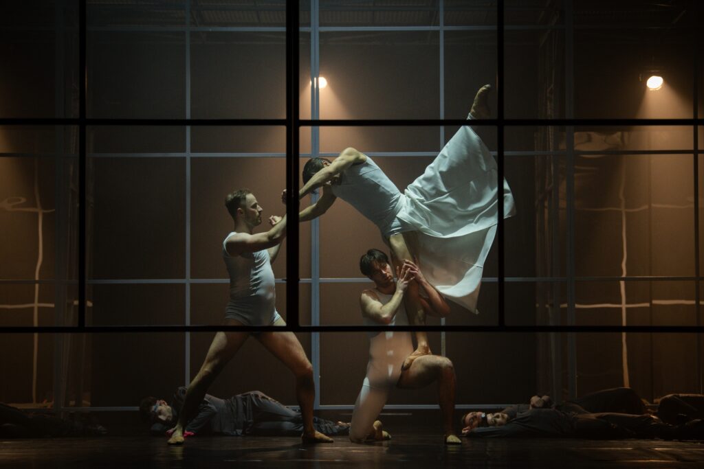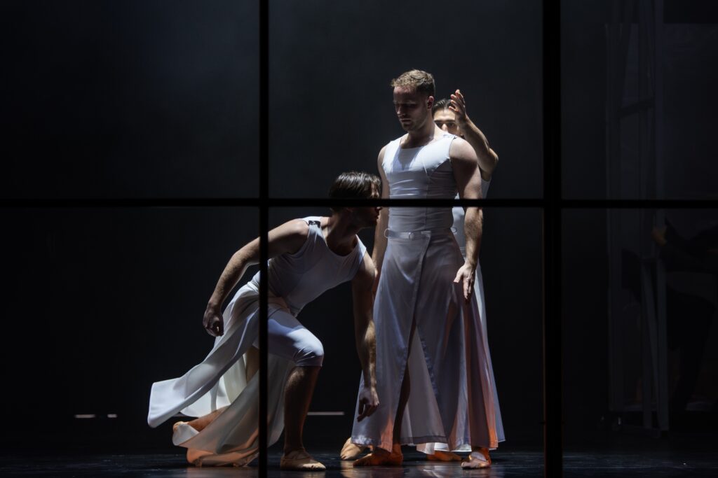 V druhej sa libreto koncentruje na trojicu ústredných mužských postáv, ku ktorým sa pridávajú tri ženské s rovnakými menami – sóla tancovali Tetiana Lubska, Vlada Schevchenko a Shoko Yamada. Počuť v úvode ďalšiu skladbu projektu SYML, vedeli ste, že spomalíme, na menšej ploche sa budú odohrávať tanečné prvky zamerané na sólistické výkony. Efektné kovové rámy, v ktorých uviazli ústrední hrdinovia ako vo väzení, v izolácii, využil Šoth veľmi umne. Pred očami sa nám odohrávalo vysoko estetické tanečno-hudobné divadlo, performancia s ťažkými prvkami oboch párov. Sú to všetko sólisti s krásnymi, plastickými pohybmi a dokonalou technikou. Ich synchronizácia bola vycibrená, no niesla znaky prirodzenosti. Výkony Lubskej, Schevchenko, Yamady, Stariňáka, Sorbina a Báyaia boli dychberúce. Od davu ich odlišovala biela farba totožne navrhnutých kostýmov – dámskych i pánskych (kostýmy navrhol Andrii Sukhanov). Hudbu volil v druhom dejstve Šoth priam éterickú, no vždy ostáva sugestívnym prvkom inscenácie.