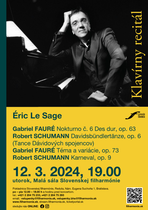 V utorok 12. marca o 19.00 sa v Malej sále Slovenskej filharmónie uskutoční piaty Klavírny recitál. Hosťom Slovenskej filharmónie bude francúzsky klavírny virtuóz Éric Le Sage, laureát mnohých medzinárodných interpretačných súťaží, víťaz Medzinárodnej súťaže Roberta Schumanna v Zwickau v roku 19...