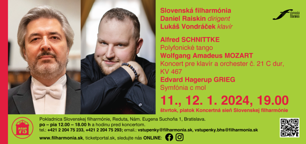 Január v Slovenskej filharmónii otvorí dvojica symfonických koncertov so šéfdirigentom Danielom Raiskinom. Sólistom večerov bude český klavírny virtuóz Lukáš Vondráček. Pod taktovkou šéfdirigenta zaznejú diela Alfreda Schnittkeho, Wolfganga Amadea Mozarta a Edvarda Hagerupa Griega. Vo štvrtok a pia...