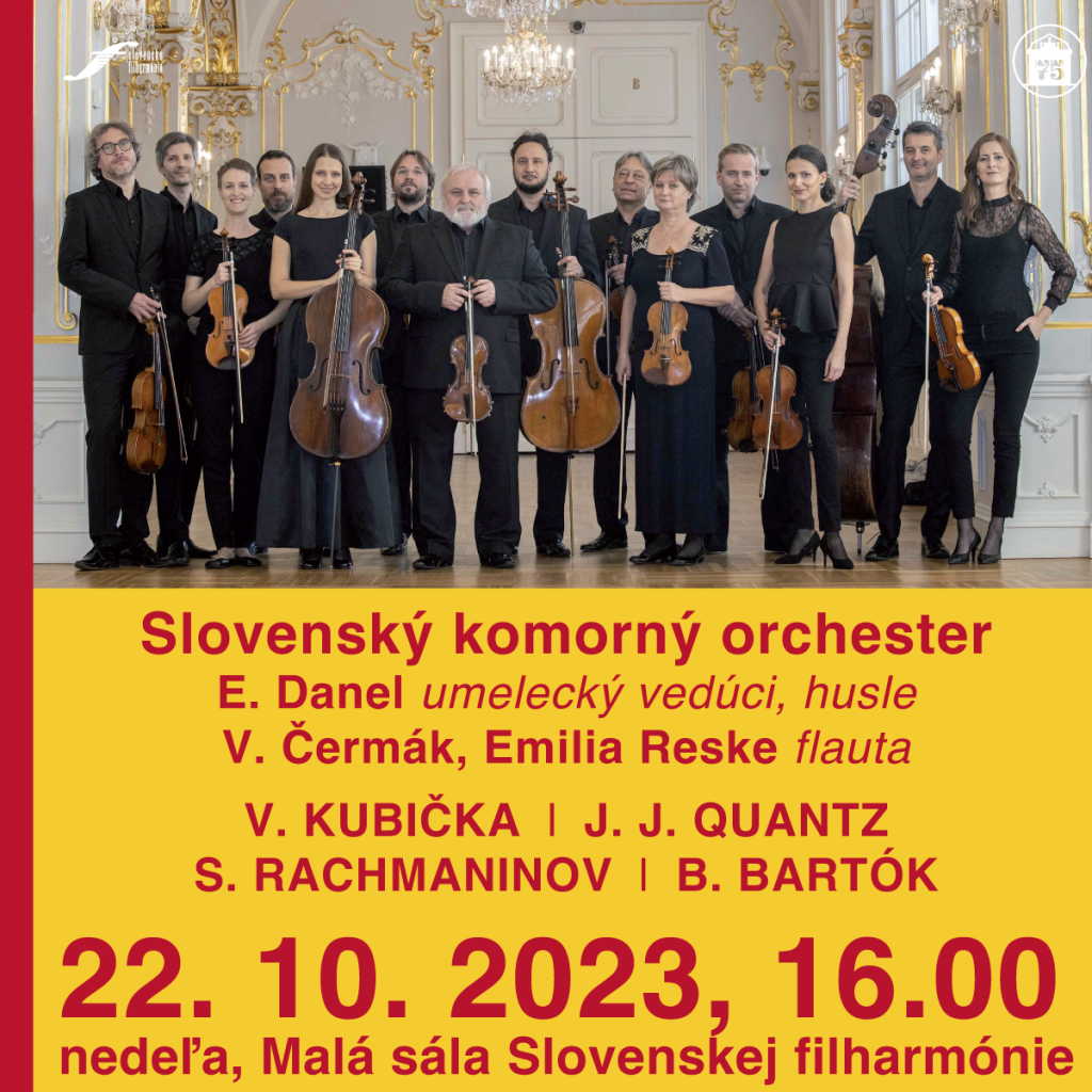 Na úvod koncertu zaznie v premiére dielo slovenského skladateľa Víťazoslava Kubičku Bože, smiem ísť k Tebe, ktorá je malým obzretím sa za jeho doterajším životom, pri príležitosti životného jubilea. „Do skladby som zakomponoval niekoľko mne drahých motívov, ktoré patria k môjmu hudobnému krédu po celý môj život,“ hovorí skladateľ. Nasledovať bude Koncert pre dve flauty a orchester g mol Johanna Joachima Quantza. Sólistami nedeľného popoludnia budú dvaja mladí flautisti – Čech Vojtěch Čermák a Poľka Emilia Reske, víťazi Medzinárodnej súťaže Flautiáda, ktorá je etablovanou flautovou súťažou v Európskom hudobnom priestore a teší sa veľkej obľube a záujmu nielen zo strany mladých hudobníkov, ale aj odbornej verejnosti z celej Európy. Program doplnia diela Sergeja Rachmaninova a Bélu Bartóka pre sláčikový orchester. Sláčikové kvarteto č. 1 Sergeja Rachmaninova, ktoré bolo vydané až 58 rokov po jeho skomponovaní v roku 1947. Na záver nedeľného programu zaznie v interpretácii Slovenského komorného orchestra trojčasťové Divertimento pre sláčikový orchester Bélu Bartóka z roku 1939, ktoré vzniklo na objednávku Paula Sachera, švajčiarskeho dirigenta, mecenáša a zakladateľa Bazilejského komorného orchestra. Je to posledné dielo skladateľa pred emigráciou z Maďarska do USA, pred vypuknutím druhej svetovej vojny.