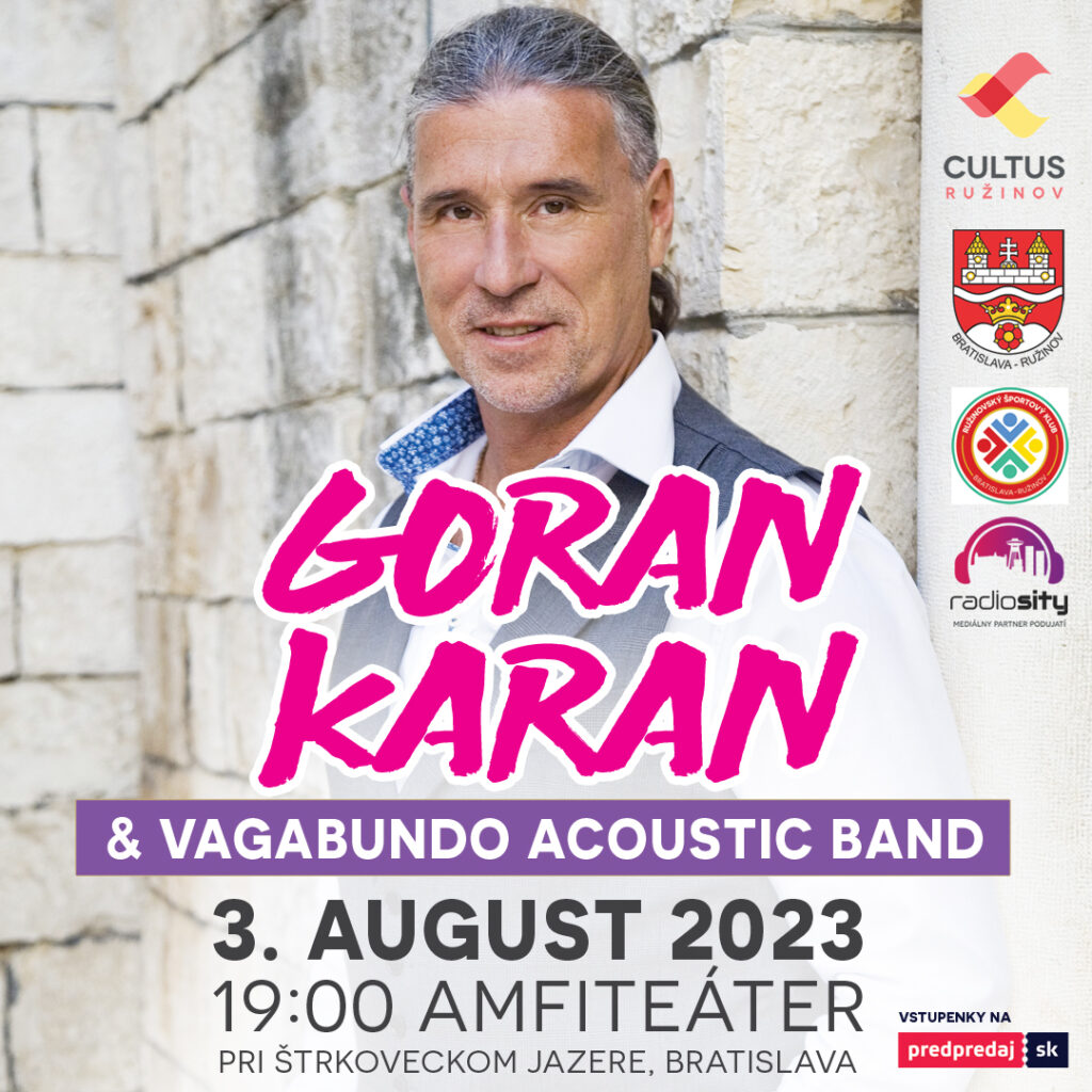 Jedna z najväčších hudobných hviezd Chorvátska, so svojím zamatovým hlasom a akustickou kapelou Vagabundo, zaspieva naživo už 3. augusta 2023 v bratislavskom Ružinove. Koncert sa koná exkluzívne pod holým nebom v Amfiteátri pri Štrkoveckom jazere o 19:00 hod. Tvorba Gorana Karana vychádza z Dalmáts...