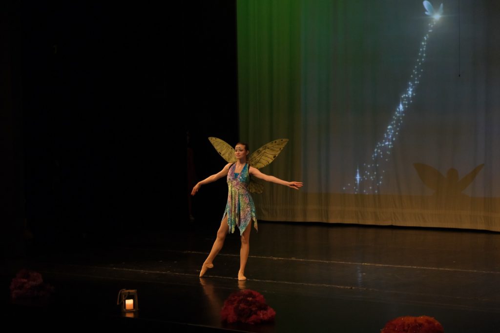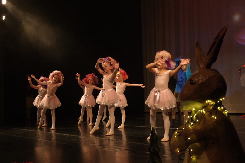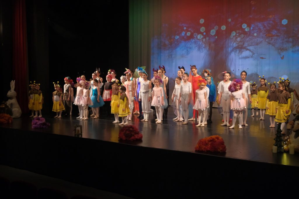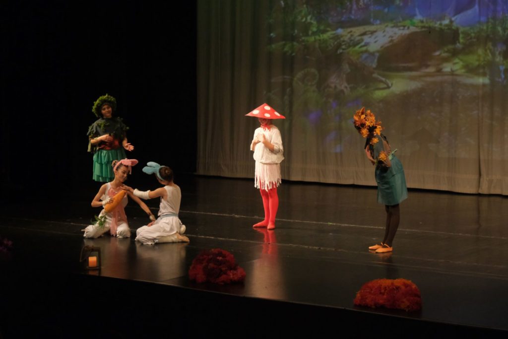 V prvej časti programu nazvanej Čarovný les, vystúpili najprv menšie deti prvého stupňa štúdia. Pravidelné a cyklické opakovania krokov a pohybov v choreografiách zostavených Janou Gallovich Bílkovou sme videli v číslach, v ktorých vystupovali Motýliky - žiačky 2. r., Kvetinky - žiaci 1. r. a Včielky - žiaci prípravného štúdia 1, 2. Boli to príbehy, ktoré stvárnili žiaci nesmierne živo, v dobrej rytmickej koordinácii, v pohybovom súlade a vďaka kostýmom aj farebne. Hudba nielen udávala rytmus a tempo ich tanečným výkonom, no náladovo podfarbovala jednotlivé choreografie. Od rytmicky svižných skladieb, cez zádumčivé, v pomalšom tempe, či sólovom klavíri, zvonkohre pripomínajúcej vzdialenú fantazijnú ríšu, sme počuli vždy štýlovo rozmanitú hudbu. Celkové vyznenie podporovali projekcie na zadnom plátne – keď účinkovali včielky, za nimi sa rozprestrela nádherná zakvitnutá lúka. Boli to komplexné mini-dielka, ktoré boli do posledného detailu znázornené – nielen pohybovou zložkou, ale i hudobnou, svetelnou, výtvarnou a kostýmovou.