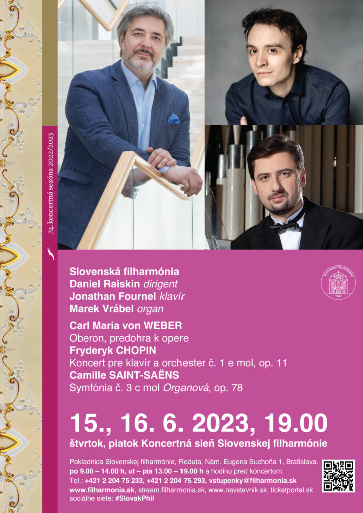 Aktuálnu 74. sezónu Slovenskej filharmónie uzavrie symfonickou dvojicou koncertov vo štvrtok a piatok 15. a 16. júna 2023 Daniel Raiskin. Sólistami večerov budú belgický klavírny virtuóz Jonathan Fournel a slovenský organista Marek Vrábel. Koncerty sa začnú o 19.00. Na úvod večerov zaznie v naštudo...