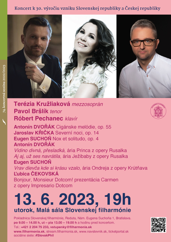 Na programe sú diela Antonína Dvořáka, Jaroslava Křičku, Mikuláša Schneidera-Trnavského, Eugena Suchoňa, Ľubice Čekovskej a Ľuboša Bernátha. Koncert otvoria Cigánske melódie, op. 55 Antonína Dvořáka, ktoré patria k vrcholom skladateľovej piesňovej tvorby. Vznikli v roku 1880 na želanie významného tenoristu viedenskej Dvornej opery Gustava Waltera.