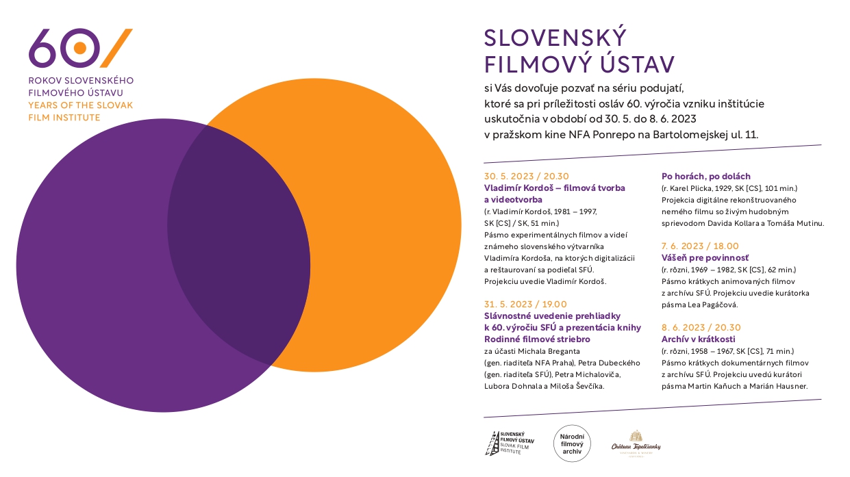 V utorok 30. mája sa v Prahe v kine Ponrepo začne prehliadka Slovenského filmového ústavu (SFÚ), ktorá ponúkne prienik do málo známych činností filmového archívu. SFÚ ju organizuje pri príležitosti tohtoročného 60. výročia svojho založenia v spolupráci s českým Národným filmovým archívom (NFA) Praha, ktorý diela zo svojich zbierok uvedie recipročne na jeseň v Bratislave pri príležitosti svojho 80. výročia vzniku. Obe partnerské pamäťové inštitúcie chcú poukázať na dôležitosť uchovávania a digitalizácie audiovizuálneho dedičstva. Prehliadka nazvaná 60 rokov Slovenského filmového ústavu v Prahe potrvá do 8. júna.