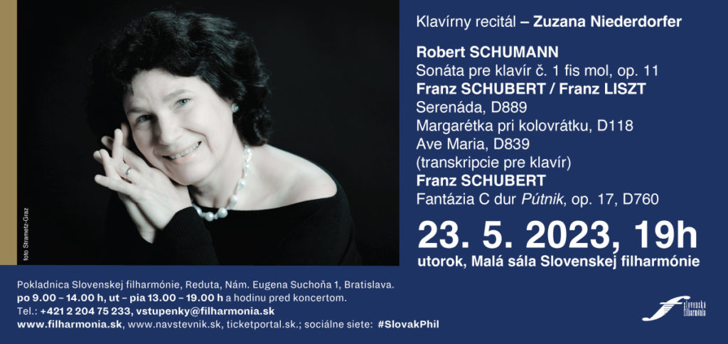 V utorok 23. mája 2023 sa v Slovenskej filharmónii uskutoční záverečný koncert cyklu Klavír a klaviristi. V Malej sále Slovenskej filharmónie sa predstaví popredná slovenská klaviristka, pôsobiaca v Grazi, Zuzana Niederdorfer. Koncert sa začne o 19.00. Na úvod utorkového večera zaznie Sonáta pre k...