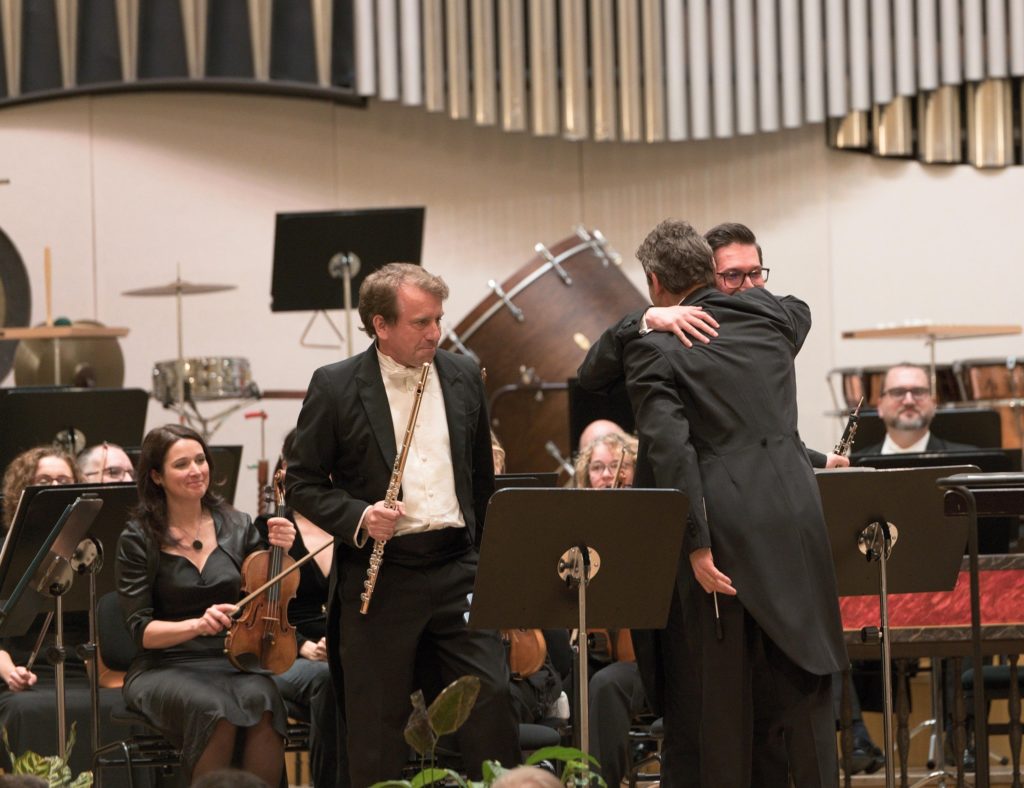 Prví hráči orchestra Slovenská filharmónia – flautista Cyril Šikula, hobojista Matúš Veľas, fagotista Peter Kajan a hráč na lesný roh Róbert Kis sa spoločne predstavili v Koncertantnej symfónii Wolfganga Amadea Mozarta Es dur, KV 297b. Úprimne sa priznám – nie, že by som si túto skladbu so záujmom púšťala mimo koncertných sál dobrovoľne vo voľnom čase. Mozart má nepochybne aj invenčnejšie, hĺbavejšie diela. Navyše, o autorstve tohto kusu sú pochybnosti, najmä čo sa týka inštrumentácie a orchestrácie, ktoré pre skladateľa nie sú charakteristické. Ďalšia skupina mozartológov je však presvedčená, že práve melodická invencia je pre autora typická. Každopádne, Koncertantnú symfóniu dnes uvádzajú ako dielo Mozarta a zámer koncertu bol jasný. Uviesť publiku sólových hráčov orchestra, ktorí majú v diele virtuózne časti. Na koncerte znel Mozart v rekonštruovanej verzii Roberta D. Levina s flautou ako sólovým nástrojom (len pripomíname, že práve Kaspar Zehnder je vyštudovaný flautista a je vynikajúcim hráčom), no všetky uvedené nástroje majú v diele dôležitú úlohu. „Kvarteto“ prvých hráčov orchestra Slovenská filharmónia si na svoje sóla počkalo – dielo otvára dlhá introdukcia. Tá pripravuje na nástup štyroch sólistov, ktorí sa majú stať centrom diania. Už len tá najmenšia chyba je vypuklou, sú to party v rýchlych tempách, ktoré ich v prvej časti publiku predstavia. Všetci štyria sólisti predviedli svoje sóla s energiou a a radosťou, ktorá k Mozartovmu (alebo skôr Levinovmu) štýlu patrí.